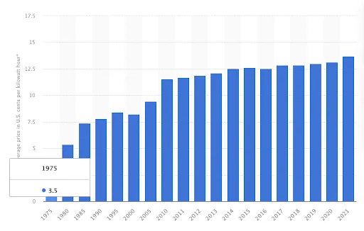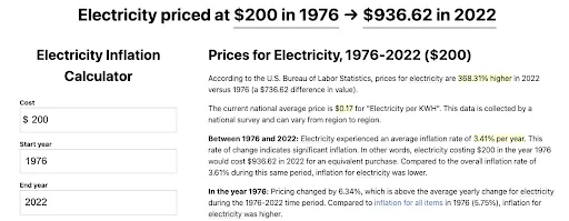 Y mirando la imagen de arriba, vemos la tasa de inflación de una factura de electricidad de $200 en 1973. ¡Pero hoy vale más de $1,000! Nuevamente, esa es una diferencia de 5x en las tarifas.